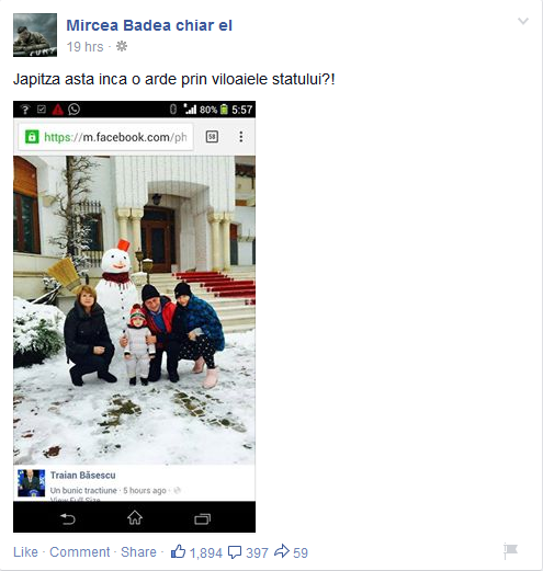 După ce președintele a postat poze de la munte unde stă, alături de familia sa, în una dintre fostele case ale lui Nicolae Ceaușescu, Badea a avut un comentariu dur la adresa fostului președinte, așa cum reiese din poza de mai sus: ”Japitza asta inca o arde prin viloaiele statului?!”, a scris Badea.