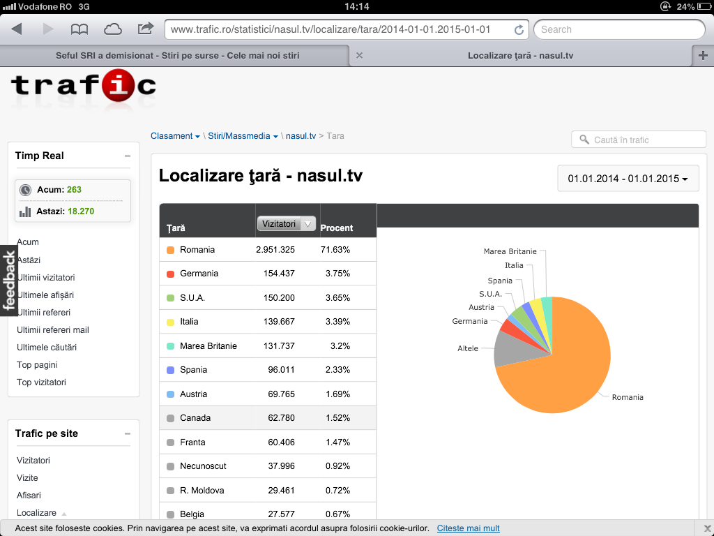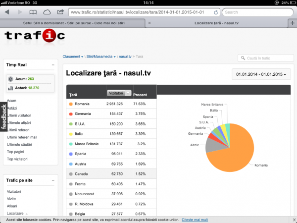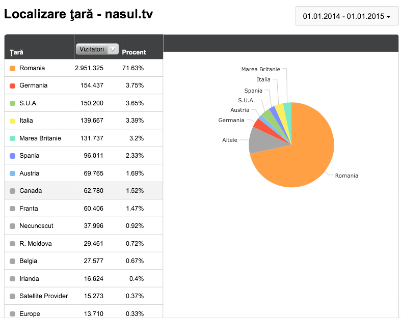 Aproape 4 milioane de cititori în 2014 proveniți numai din România și Top 10 Țări ! În plus, cititorii site-ului NASUL.TV sînt răspîndiți pe întreg globul, în cele mai exotice locuri posibile. Puteți consulta mai jos harta NASUL.TV !