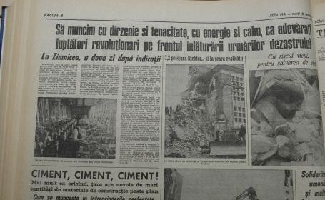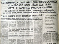 „Eram santinela pe acoperisul unui important obiectiv militar; adica, deasupra etajului sapte. Noaptea era destul de luminoasa si de vazut, puteam vedea pana departe. Numai ca odata parca n-am mai simtit acoperisul sub picioare. M-am apucat insa bine de ceva si cu ochii numai primprejur, sa vad ce se intampla. Dar nu-mi puteam crede ochilor. Cat vedeam cu ochii, toate blocurile se clatinau. Si toate cladirile se inclinau de-o parte si de cealalta ca si copacii pe furtuna. Prima unda a fost pe verticala. Cateva fractiuni de secunda a parut sa inceteze, dar apoi a reinceput pe orizontala. Cerul a crapat brusc, de parca statea sa se franga in doua. Am auzit detunaturi indepartate, apoi un zgomot infundat, care parca venea de peste tot; se auzea tot mai tare. Apoi a venit un vant puternic, de era sa ma azvarle jos. S-a dus, dar apoi s-a intors inapoi, de data asta cu miros greu de ars. Si pe urma s-au stins toate luminile… pe cer era un urias arc de foc, ca si cum s-a produs un scurtcircuit in tot orașul… Si atunci am zis: Gata, cred ca-i gata orașul!”, spune Mircea Nemigean, soldat in termen, la acea data fatidica, la o unitate militara din Bucuresti.