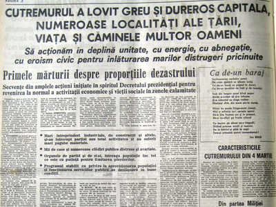 Potrivit istoriei consemnate, cutremurul, cu epicentrul in Muntii Vrancei, a avut o magnitudine de 7,4 grade pe scara Richter, s-a produs la o adancime de 94 de km si a avut o durata de 55 de secunde. Seismul a avut loc la ora 21.22 si s-a resimtit aproape in toata regiunea balcanica. Cele mai lovite orase au fost Bucuresti si Zimnicea, care a fost aproape ras de pe fata pamantului. Bilantul victimelor si al pagubelor materiale a fost devastator: 1.578 de persoane si-au pierdut viata, din care 1.424 în Bucuresti.