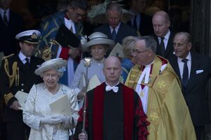 Suverana, in varsta de 87 de ani, a fost intampinata de decanul catedralei si de printul Charles, mostenitorul coroanei britanice. Chiar inaintea suveranei au sosit printul Charles si sotia sa, Camilla, ducii de Cambridge, William si Catherine. Catherine, insarcinata, a purtat o rochie din dantela si pe deasupra o tunica pana la genunchi de culoarea piersicii, creatie a britanicului Jeremy Packham.