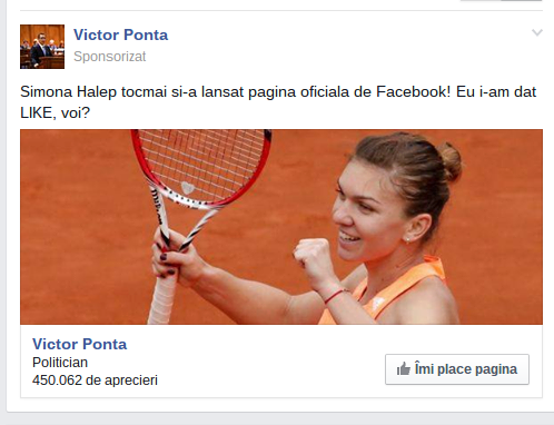 Ponta a publicat o imagine a Simonei pe pagina sa de Facebook si a scris: „Simona Halep tocmai si-a lansat pagina oficiala de Facebook! Eu i-am dat LIKE, voi?”. Si, cu toate ca poza Simonei era langa butonul de „Like”, pagina care devenea mai populara era a lui Victor Ponta.