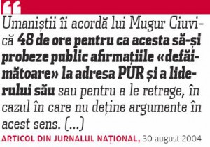 „Umaniștii îi acordă lui Mugur Ciuvică 48 de ore pentru ca acesta să-și probeze public afirmațiile «defăimătoare» la adresa PUR și a liderului său sau pentru a le retrage, în cazul în care nu deține argumente în acest sens. (…)