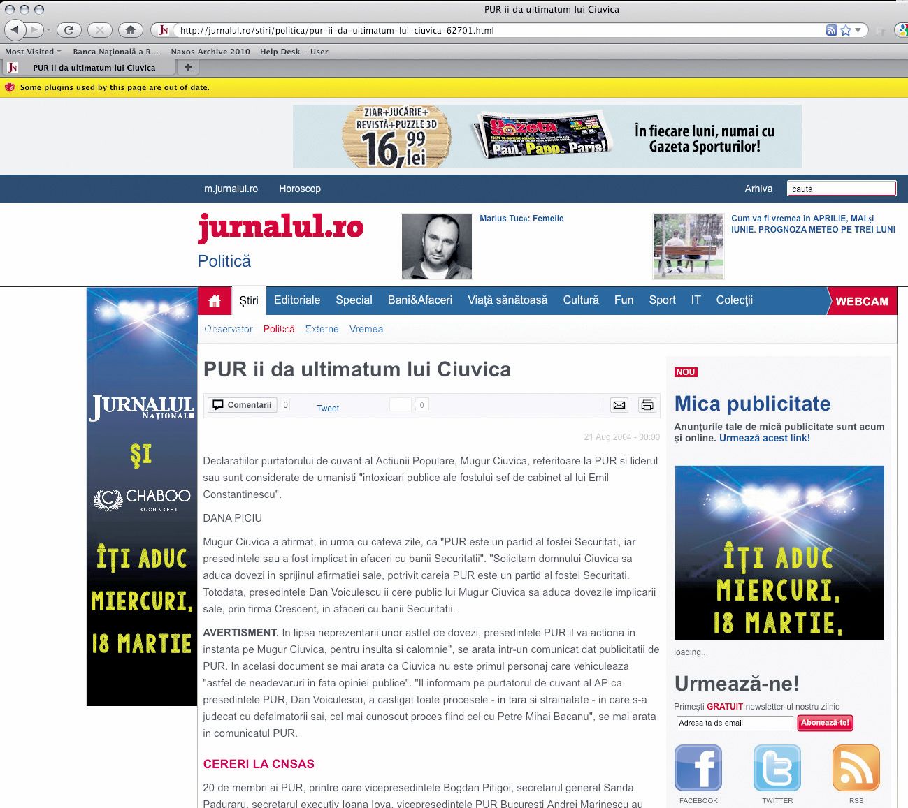 În 21 august 2004, Jurnalul Național, cotidian din trustul lui Dan Voiculescu, condus de Marius Tucă, declanșează atacul împotriva Mugur Ciuvică.