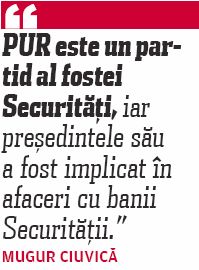 Mugur Ciuvică a afirmat, în urmă cu câteva zile, că „PUR este un partid al fostei Securități, iar președintele său a fost implicat în afaceri cu banii Securității”. „Solicităm domnului Ciuvică să aducă dovezi în sprijinul afirmației sale, potrivit căreia PUR este un partid al fostei Securități. Totodată, președintele Dan Voiculescu îi cere public lui Mugur Ciuvică să aducă dovezile implicării sale, prin firma Crescent, în afaceri cu banii Securității.