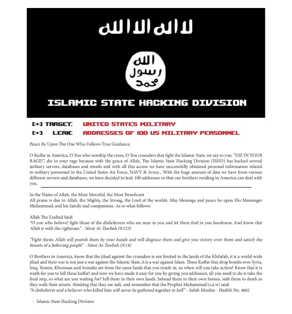 Numele militarilor, fotografiile și adresele acestora au fost postate pe un website alături de îndemnul expres adresat „fraților rezidenți în America” de a-i ucide. Divizia de net a ISIS, autointitulată Islamic State Hacking Division, spune că persoanele trecute pe așa-numita listă a morții au participat la misiunile americane contra Statului Islamic.