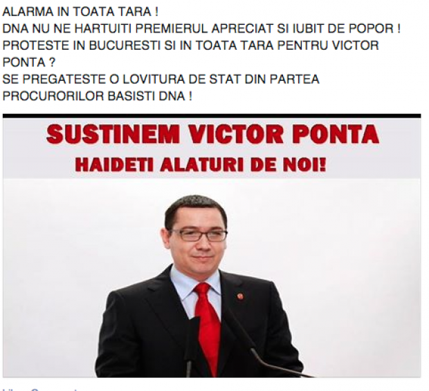 „ALARMA IN TOATA TARA! DNA nu ne hatuiti premierul apreciat si iubit de popor. Proteste in Bucuresti si in toata tara pentru Victor Ponta? Se pregateste o lovitura de stat din partea procurorilor basisti DNA!”, este mesajul militantilor PSD de pe retelele de socializare.