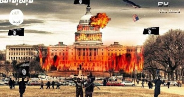Intr-una dintre ele este vazut Capitoliul american din Washington in flacari, deasupra caruia flutura un steag al Statului Islamic, cel american fiind aruncat.