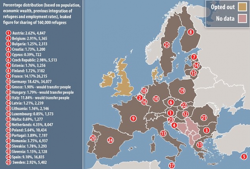 Un documentul al UE „scurs” în presă relevă un nou plan oficial, prin care ţările europene ar urma să prea 160.000 de refugiaţi, de patru ori mai mult decât s-a convenit iniţial. Potrivit publicaţiei britanice Daily Mail, România ar urma să prea aproape 7000 de refugiaţi, nu 1700, cum s-a anunţat iniţial. Germania ar prelua 35.000 de refugiaţi, Franţa 26.000, iar Spania 16.000.