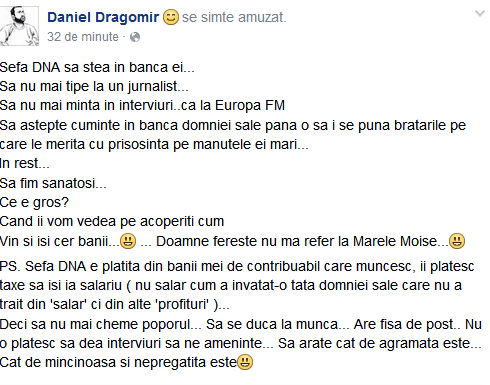 „Ce e gros?Cand ii vom vedea pe acoperiti cum vin si isi cer banii…???? … Doamne fereste nu ma refer la Marele Moise…???? PS. Sefa DNA e platita din banii mei de contribuabil care muncesc, ii platesc taxe sa isi ia salariu ( nu salar cum a invatat-o tata domniei sale care nu a trait din ‘salar’ ci din alte ‘profituri’ )…Deci sa nu mai cheme poporul… Sa se duca la munca… Are fisa de post.. Nu o platesc sa dea interviuri sa ne ameninte… Sa arate cat de agramata este… Cat de mincinoasa si nepregatita este”, a mai afirmat Dragomir, citat de flux24.ro