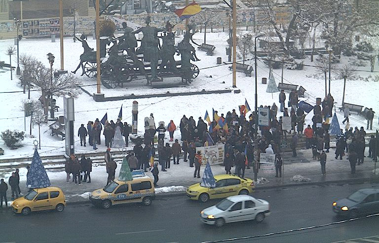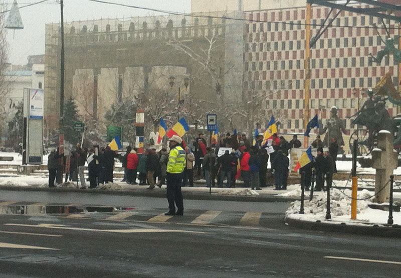 Câteva zeci de persoane au venit în această după-amiază în fața Teatrului Național din București, pentru a marca un an de la de la izbucnirea protestelor anti-guvernamentale și anti-prezidențiale care au avut loc în ianuarie 2012. Acestea erau îndreptate, în acel moment, spre Guvernul Boc şi preşedintele Traian Băsescu și aveau drept scop susținerea secretarului de stat din Ministerul Sănătății, Raed Arafat.