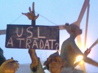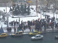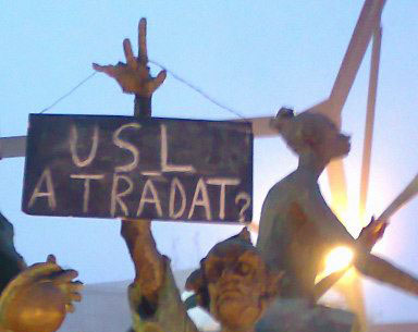 UPDATE (18:45) Circa 200 de persoane participă, duminică seară, la un miting în Piața Universității din București. Oamenii, adunați în fața Teatrului Național în stadiu de reconstrucție, agită pancarte, steaguri și scandează diferite lozinci împotriva clasei politice. Pe statuile din fața teatrului au fost arborate steaguri si pancarte, printre care si una cu textul „USL a trădat”.