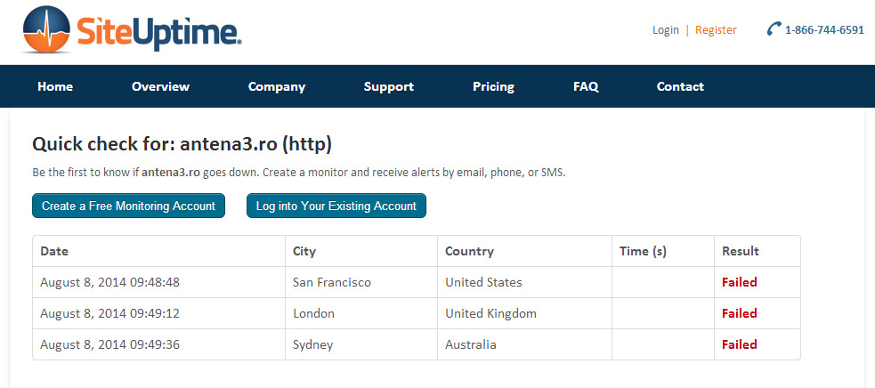 O verificare efectuată pe site-ul de specialitate SiteUptime.com indică faptul că antena3.ro nu poate fi accesat nici din străinătate.
