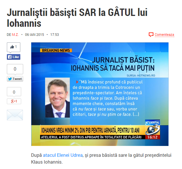 Astfel, Antena 3 s-a transformat din instrument de linşaj mediatic anti-Iohannis (vezi atacurile din campanie cu trafic de copii, afaceri imobiliare şi religia neortodoxă) în apărător al preşedintelui în lupta cu …băsiştii! În încercarea de a transmite justiţiei mesajul că ea e de partea lui Iohannis, Antena 3 a sărit la gâtul celor care şi-au permis să critice erorile actualului preşedinte. Unul dintre cei vizaţi este Dan Tăpălagă, de la Hotnews.