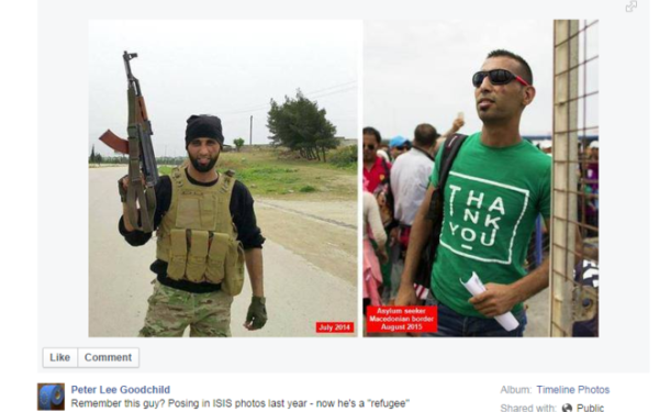 In ultimele zile, temerile europenenilor au fost alimentate si de o fotografie raspandita cu repeziciune pe social media. In colajul care circula online apare fotografia unui sirian intr-un echipament militar, asemanator si celor purtate si de jihadisti, realizata in 2014, potrivit precizarilor. Acelasi barbat a fost fotografiat undeva la granita macedoneana in august 2015. „Anul trecut a pozat ca jihadist, acum e refugiat!” este mesajul care insoteste imaginea.