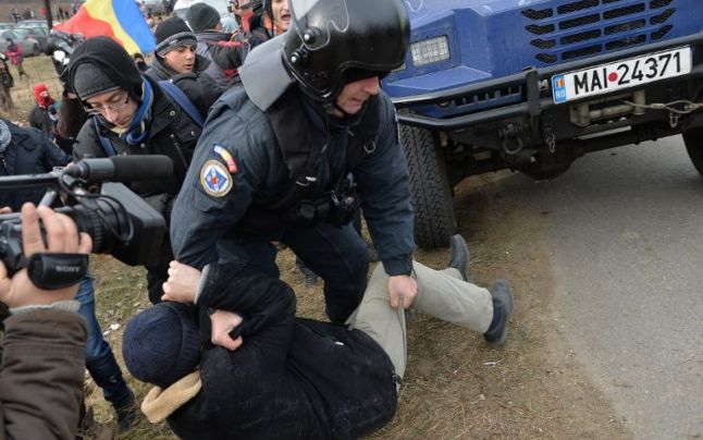 La data de 2 decembrie 2013 a existat cea mai violentă ciocnire între protestatari şi jandarmi. Forţele de ordine, într-un număr impresionant, purtând cagule și echipate cu scuturi, gaze lacrimogene și bastoane, au intrat în forţă în cortul protestatarilor, aflat pe un teren privat, în jurul orelor 4 dimineaţa pentru a împrăştia cei cca. 20 de protestatari care se aflau în tabăra lor. În urma acestor violenţe mai mulţi manifestaţi au fost urcaţi în dube şi duşi la IPJ Vaslui pentru a fi amprentaţi şi fotografiaţi. Pe perioada conducerii administrative protestatarilor li s-au închis telefoanele mobile pentru a nu putea comunica. Unora dintre acestea li s-au deschis dosare penale. Ca urmare a acţiunii jandarmilor aproximativ 150 de săteni s-au solidarizat cu cei din tabără pentru a se opune violenţelor forţelor de ordine și au blocat drumul județean. Incidente violente au avut loc pe tot parcursul zilei iar jandarmii au blocat circulația pe drumul județean montând garduri metalice. Până a doua zi zona a fost complet izolată. Trebuie precizat că inclusiv accesul jurnaliștilor a fost restricționat astfel că foarte puțini au putut relata de la fața locului. Ca urmare, cele mai multe știri despre incidente s-au bazat pe informații puse la dispoziție de jandarmerie.