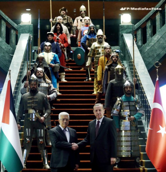 Conform Bloomberg, Erdogan a organizat o ceremonie speciala cu ocazia primirii presedintelui palestinian Mahmoud Abbas. Presedintele turc l-a intampinat in mijlocul a 16 soldati imbracati in culorile razboinice regale, semnificand cele 16 state care au existat in trecut in Turcia, in timpul imperiului.