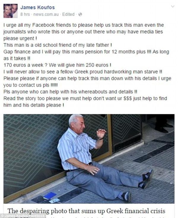 Cu toate acestea, el nu a reusit sa il contacteze pe batran. Koufos a lansat un apel pe Facebook. „Urgent, ii rog pe toti prietenii mei sa ne ajute sa il gasim pe acest om. Este un fost prieten al tatalui meu. Ii voi plati pensia pentru inca 12 luni. 120 de euro? Ii vom da 250 de euro! Nu voi permite niciodata ca un compatriot grec, un om mandru si muncitor, sa faca foamea!!”, a scris omul de afaceri.