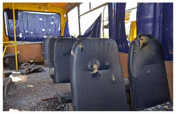 „30 de minute in urma, din directia Dokuchaevsk a fost efectuat un atac de artilerie al militanților rebeli spre punctul de control ucrainean de la Volnovakha. Un autocar cu pasageri a fost lovit direct. Sunt 10 de morți și 13 de răniți. Informațiile sunt verificate. La faţa locului se afla o echipa de investigare a Ministerului de Interne al Ucrainei„, – a scris Abroskin.