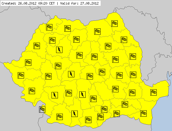 Administraţia Naţională de Meteorologie a emis o avertizare cod galben de furtuni, valabilă din această seară de la ora 21:00, până marți 28 august la ora 09:00. În această perioadă instabilitatea atmosferică se va accentua şi va cuprinde treptat toate regiunile, începând din vestul și nord-vestul ţării, continuând cu partea de est și apoi cu cea de sud.