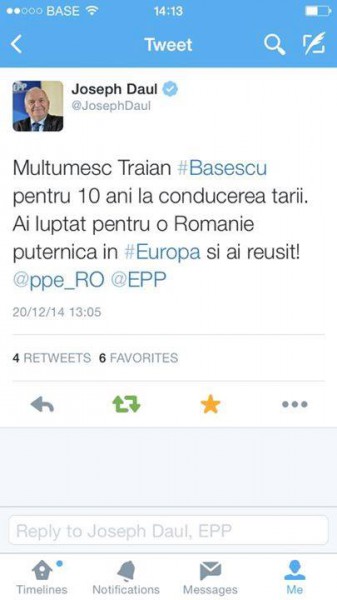 Joseph Daul pe Twitter: „Multumesc Traian Băsescu pentru 10 ani la conducerea tarii. Ai luptat pentru o Romanie puternica in Europe si ai reusit!”