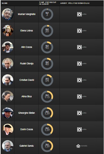 Cei mai multi dintre ei au invatat deja ca sintagma „arestat pentru 30 de zile” se dovedeste a fi un miraj. Gheorghe Stefan si Dorin Cocos se afla in spatele gratiilor inca din luna octombrie a anului trecut. Sederea lor in arest a fost mereu prelungita, iar cu arest la domiciliu a reusit sa scape momentan doar Gabriel Sandu. Alina Bica a primit si ea acceptul de a fi inchisa in propria casa, dar in doar unul din cele doua dosare pentru care a primit mandat de arestare.