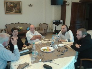 Priviti fotografia de mai jos. Instantaneul, realizat ieri, 24 iunie 2014, in incinta restaurantului Diesel din Floreasca ii infatiseaza, de la stinga la dreapta, pe Eugen Mihaescu (fost ambasador UNESCO), sotia lui Eugen Mihaescu, publicistul Mircea Popa poreclit „Kaghebistul”, Aleksandr Dughin, supranumit „ideologul lui Putin” si Calin Mihaescu, editor si initiator „Miscarea Eurasia” in Romania.