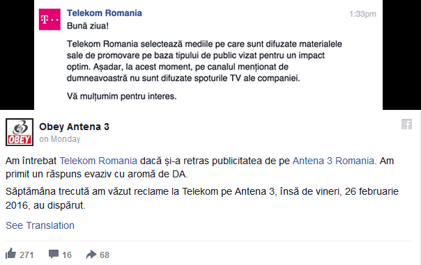 Telekom Romania a anuntat, luni, pe pagina oficiala de Facebook, ca pe canalul Antena 3 nu mai sunt difuzate spoturile TV ale companiei.