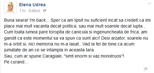 Numai că tăcerea ei e pe cale de a lua sfârșit. Fosta șefă a PMP își anunță revenirea pe pagina sa de facebook și transmite și un mesaj cifrat: ”memoria nu m-a lăsat, vad la fel de bine ca acum jumatate de an ce se intampla in aceasta tara.” și lasă să se înțeleagă că urmează dezvăluiri.