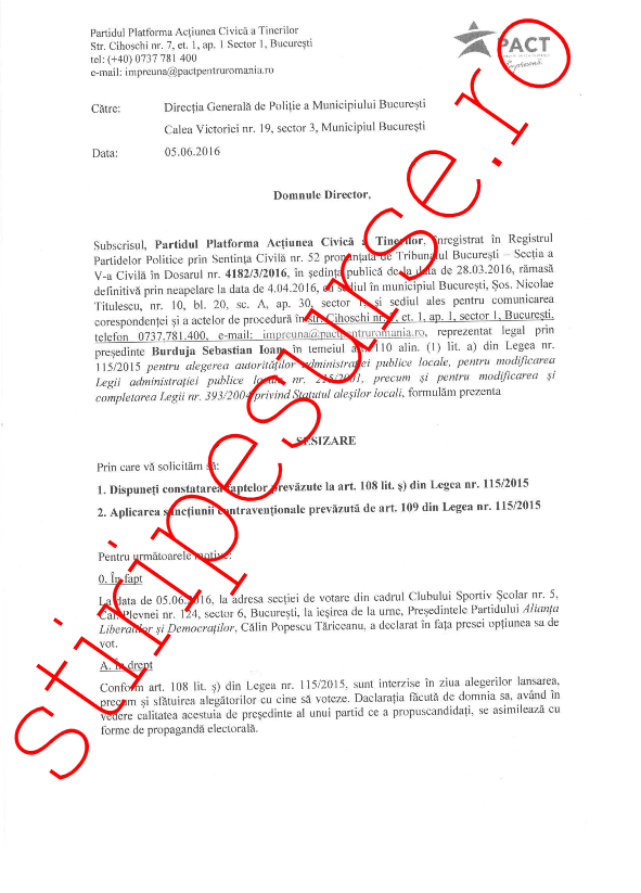 ”La data de 05.06.2016, la adresa secției de votare din cadrul Clubului Sportiv Școlar nr. 5, Cal. Plevnei nr. 124, sector 6, București, la ieșirea de la urne, Președintele Partidului Alianța Liberalilor și Democraților, Călin Popescu Tăriceanu, a declarat în fața presei opțiunea sa de vot.
