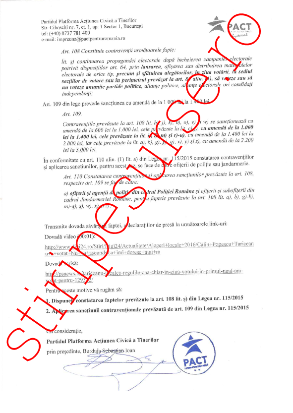 Conform art. 108 lit. ș) din Legea nr. 115/2015, sunt interzise în ziua alegerilor lansarea, precum și sfătuirea alegătorilor cu cine să voteze. Declarația făcută de domnia sa, având în vedere calitatea acestuia de președinte al unui partid ce a propus candidați, se asimilează în opinia noastră cu forme de propagandă electorală.”, a declarat Alin Iliescu, director la PACT.