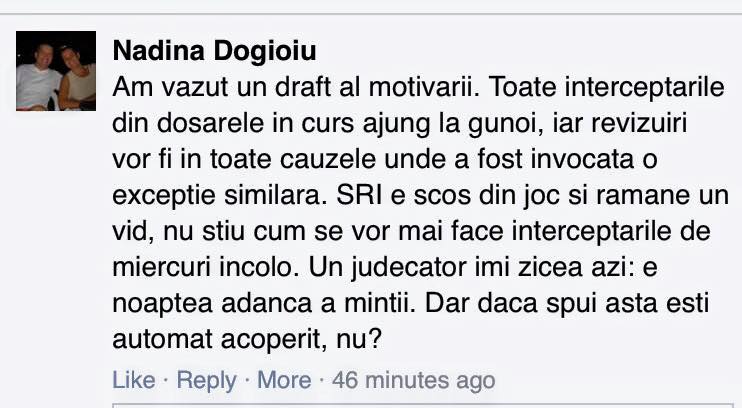 „O-la-laaaa!!! Deci Nadina Dogioiu alias Nadina Forga alias Ioana Ene, alias Ioana Ene Dogioiu alias Constantin Racaru de la ziare.com a vazut un draft al motivarii CCR???!!! Adica ea a vazut un draft al unei motivari pe care public Kovesi spunea ca nu a vazut-o si ca o asteapta??!! Da’ cine e, dom’le, tanti Dogioiu-Forga-Ene-Racaru asta?!