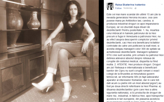 O fostă agentă secretă a Serviciului Secret al Armatei, DGIA, locotenent-colonel în rezervă, rupe tăcerea. Raisa Ekaterina Ivatenko este acum angajată ca și consilier parlamentar pentru deputata Liliana Mincă, fiind și o foarte bună prietenă a acesteia. Raisa Ivatenko s-a născut la Leningrad și a afost adoptată câteva luni mai târziu în România, informeaza ziuanews.ro.Fostă agentă a Direcției Generale de Informații a Armatei, după cum anunță chiar ea pe pagina se facebook, Raisa Ekaterina Ivatenko are un doctorat în Strategie Militară în Antiterorism la Academia Militară Khabarovsk din Rusia și a trăit în Angola și Rusia. Ivatenko a postat două informații explozive: patronul Hexi Pharma ar fi fugit în Venezuela iar la Hexi Pharma se produceau droguri de mare risc.