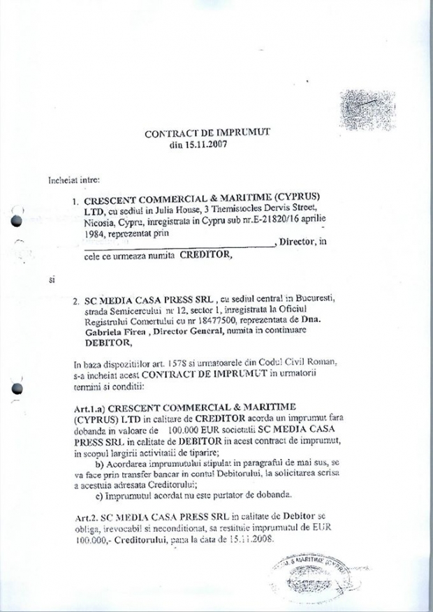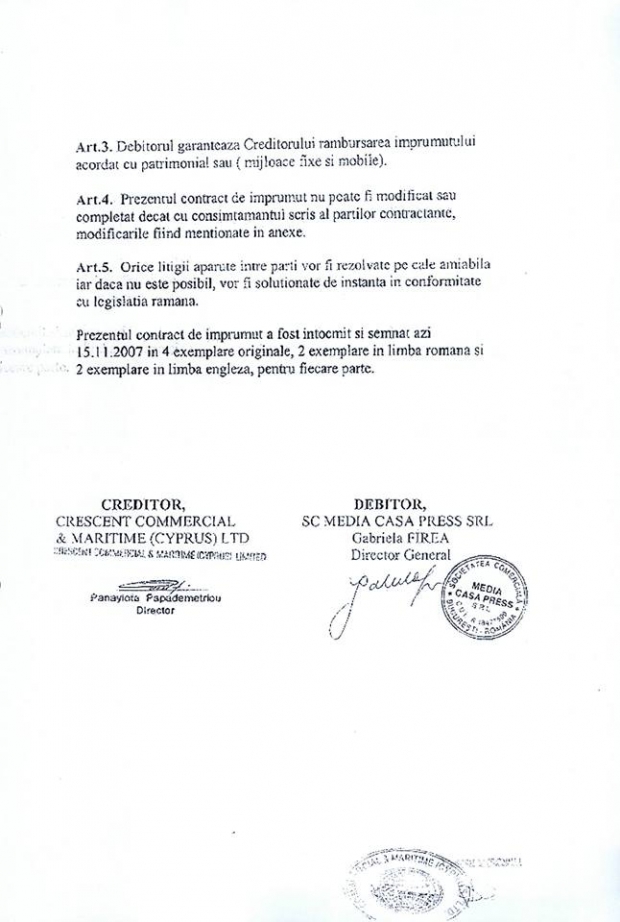 ”Contract de împrumut între Crescent, firmă a fostei securităţi şi SC Media Casa Press SRL, firmă parte a trustului turnătorului Felix, administrată de doamna Firea. Sunt convins că doamna Firea ne poate spune când s-a rambursat împrumutul”, a scris Traian Băsescu pe Facebook.