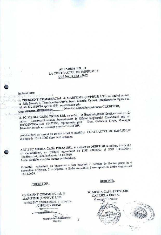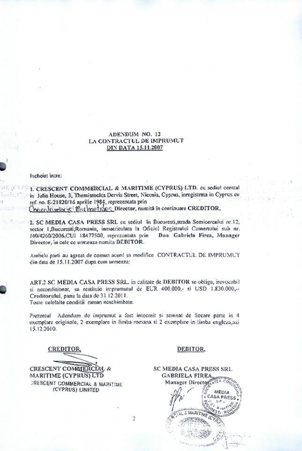Din documentele postate pe Facebook reiese că Gabi Firea, în calitate de director general al SC Media Casa Press, a contractat iniţial, în anul 2007, un împrumut de 100.000 de euro de la compania Crescent Commecial & Maritime, cu sediul în Cipru, după care prin mai multe acte adiţionale sumele împrumutate au crescut la 400.000 de euro şi 1.850.000 de dolari. Fostul Preşedinte i-a cerut Gabrielei Firea să răspundă dacă banii au fost restituiţi.
