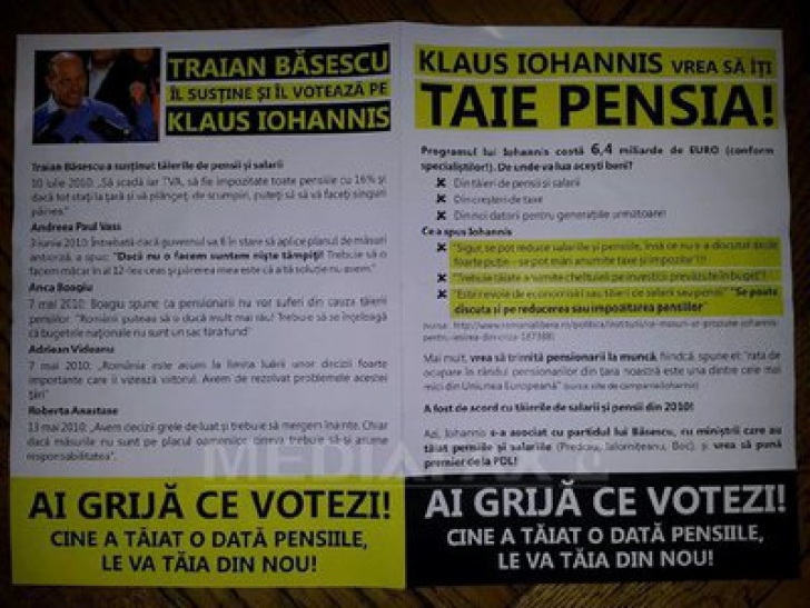 PSD transmite pensionarilor, prin intermediul Postei Romane, pliante care fac parte dintr-o campanie impotriva lui Klaus Iohannis si in care se precizeaza, in mod fals, ca acesta „va gira taieri de pensii si salarii”, solicitand publicarea contractului incheiat de PSD.