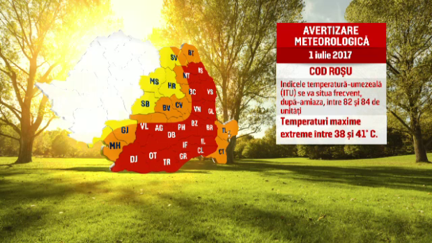 Jumatate de tara este sambata sub Cod rosu de canicula si mercurul din termometre va urca – ametitor – pana la 44 de grade la umbra. Iar in plin soare, in judetele din sud se vor resimti 59.
