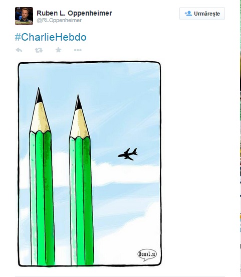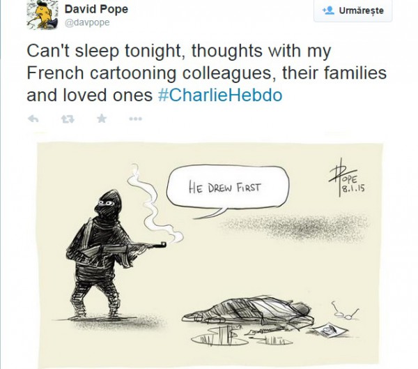 Caricaturisti din toata lumea si-au aratat, in felul lor specific, durerea si indignarea dupa atacul de la Paris, in urma caruia au murit 12 persoane, intre care si colegi de-ai lor de breasla de la revista Charlie Hebdo.
