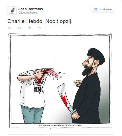 Revista satirica Charlie Hebdo difuzase pe Twitter, cu doar cateva minute inainte de atacul terorist, o caricatura care il ironiza pe Abu Bakr al-Baghdadi, liderul retelei teroriste Stat Islamic in Irak si Siria (SIIS), conform site-ului L’Internaute.com.