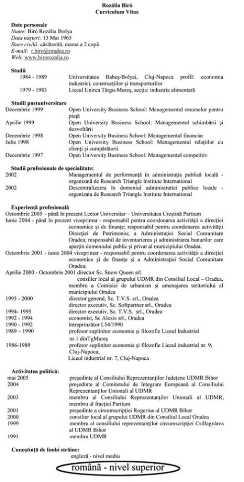 rozalia biroViitorul ministru al Culturii și vicepremier în Guvernul României, Rozalia Biro, ne va vorbi, cel mai probabil, despre problemele țării noastre în maghiară. Iar asta pentru că, în CV-ul ei depus la Senat, Biro a declarat că româna este limbă străină, pe care o cunoaște la un „nivel superior”, scrie ziuanews.ro