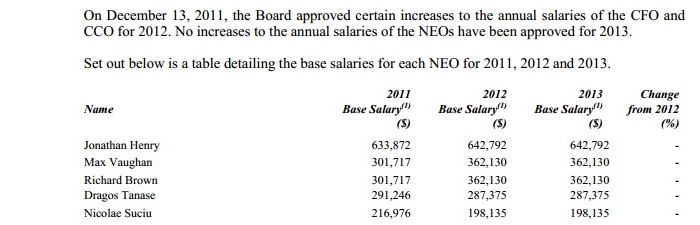 Vi se pare mult, puţin, „decent”? Să nu ne lăsăm înşelaţi de aparenţe. Salariile de bază reprezintă cea mai mică parte a veniturilor şefilor corporaţiei. Bonusurile şi premiile bazate pe „performanţa” acţiunilor lui Gabriel sunt partea cea mai consistentă. Doar în 2010, Jonathan Henry a mai adăugat salariului de bază peste 11 milioane de dolari, lucru care l-a plasat în acel an în TOP 10 al celor mai bine plătiţi CEO din Canada (foto)! La rândul lui, Dragoş Tănase şi-a mai adăugat la „compensaţiile” totale din 2010, pe lângă salariu, alţi 4,46 milioane de dolari. În total, pe trei ani (2010-2013), compensaţiile totale (salarii de bază, premii, bonusuri) acumulate de Jonathan Henry au depăşit 15 milioane dolari. Dragoş Tănase a trecut de 6 milioane de dolari, iar Nicolae Suciu de 3 milioane de dolari! Vezi şi tabelul de mai jos.