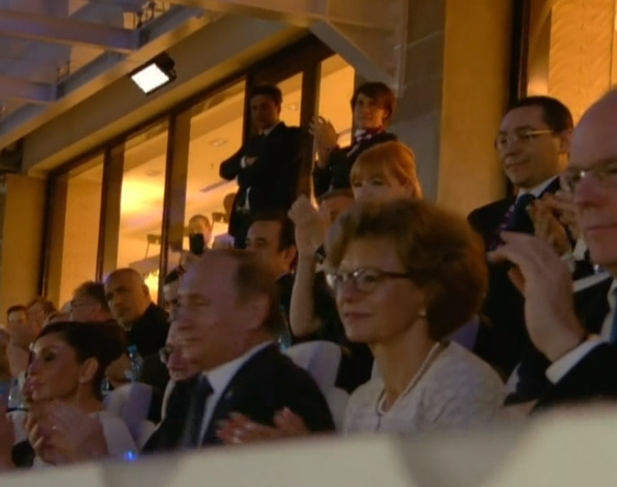 Ultima tentativă, în seara asta, la Baku, în Azerbaidjan (sursa). Oricît s-a chinuit, însă, Ponta a fost plasat cu un rînd mai sus de ceafa lui Putin, nu a avut nici măcar norocul vieții lui să-i poată cu adevărat sufla în ceafă președintelui rus. Cu toate astea, se pare că a meritat: deși se cheamă Jocuri Europene, Ponta a fost singurul demnitar european (dacă-l exceptăm pe prințul Albert de Monaco) de la ceremonia de deschidere.