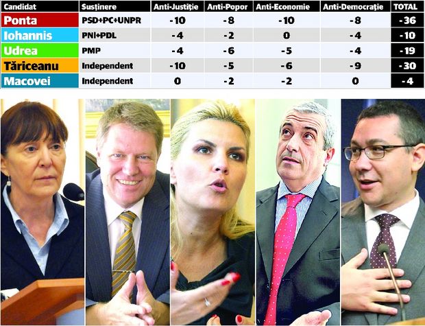 Noi nu vrem să vă spunem cu cine să votaţi duminică, la primul tur al alegerilor prezidenţiale. Cotidianul naţional PUTEREA vă sfătuieşte să mergeţi la vot, pentru că votul vostru contează! Dar noi, cei din mass-media, avem obligaţia să vă oferim informaţii. Iar cum nu suntem adepţii analizelor tendenţioase, părtinitoare, ci a studiilor de caz, vă propunem o abordare… pedagogică. De aceea, vă supunem atenţiei un „catalog” cu patru „materii”. Aceste rubrici din catalog zugrăvesc activitatea primilor cinci candidaţi împotriva următoarelor domenii de importanţă capitală pentru viitorul României: justiţie, popor, economie şi democraţie. Notele negative sunt acordate pe o scară de la 0 la 10 pentru perioada 2004-2014. Am notat cu 0 inexistenţa vreunei acţiuni “anti” şi cu -10 cea mai gravă acţiune “anti”. Candidatul care a obţinut cel mai mic punctaj negativ merită să ajungă preşedinte, iar cel cu punctajul maxim trebuie aruncat la groapa de gunoi a istoriei.