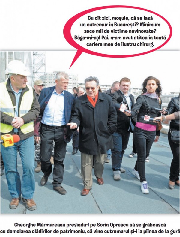 De-aia avem nevoie de un cutremur. Unul ca-n’77. Unul care să niveleze toate clădirile pline de oameni, care stau să cadă și de care nu i-a păsat nici unui guvernant din ultimul sfert de secol. Un cutremur care să omoare cîteva zeci de mii de oameni. Pentru că românul nu înțelege boala lungă. Românul suportă sărăcia, foamea, bătaia de joc din învățămînt și din sănătate, găurile din asfalt, munții despăduriți și rîurile pline de pet-uri. Românul înțelege doar de durere mare și bruscă. Niciodată nu o să facă ceva împotriva ăstora care-l obligă să facă caca-pipi, decît așa, de formă.