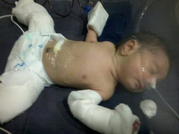 Bebeluşul de sex masculin despre care presă a scris că s-a născut “însărcinat cu fratele său” avea de fapt ascuns în spatele stomacului resturile geamănului.