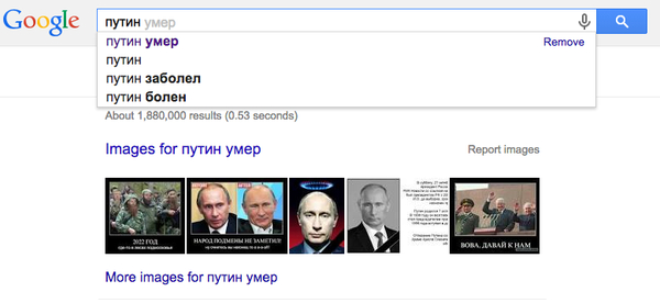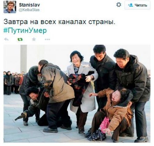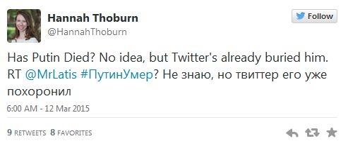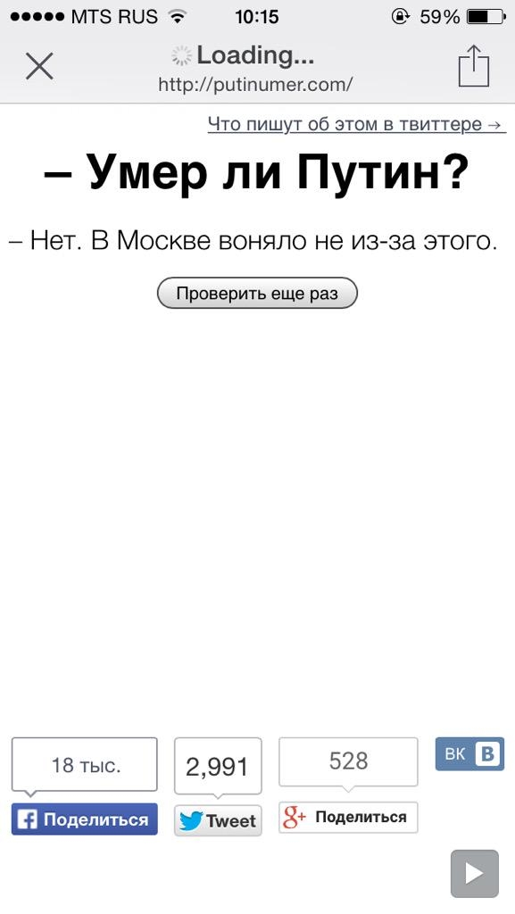 Exista si un site unde utilizatorii pot intreba daca Putin a murit, ei primind doua raspunsuri automate: „Nu, traieste” si „Nu, nu de-asta pute in Moscova”.