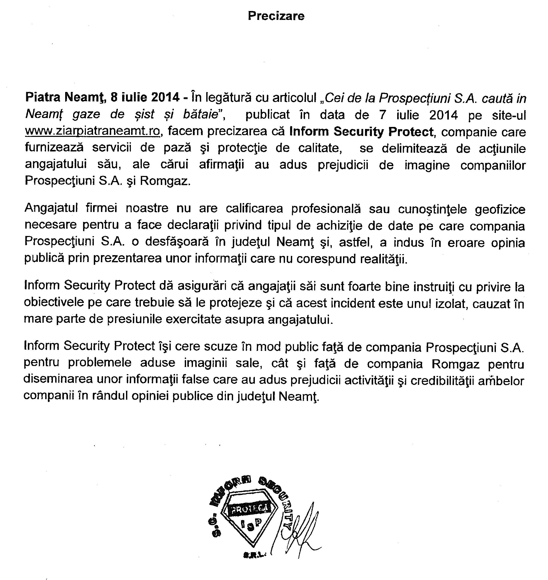 Declaraţiile angajatului companiei de pază şi protecţie Inform Security Protect nu reprezintă poziţia oficială a companiei Prospecţiuni S.A. Prospecţiuni S.A. lucrează pentru beneficiarul Romgaz in baza unui contract care are ca obiect identificarea zăcămintelor de gaze naturale convenţionale şi, prin urmare, lucrările de achiziţie a datelor din judeţul Neamţ nu au ca scop identificarea depozitelor de gaze de şist.
