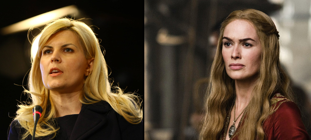 Fosta candidată la postul de președinte al României este comparată cu probabil cel mai complex personaj (rămas în viață) din serie, mai exact Cersei Lannister. Gata să facă orice pentru a le asigura copiilor săi accesul la tron, fiica lui Tywin își moștenește tatăl la strategie și lipsă de scrupule. Ambele sunt închise și devin subiectul oprobriului public.