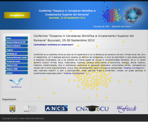 Conferinta „Diaspora in Cercetarea Stiintifica si Invatamantul Superior din Romania” se va desfasura la Bucuresti, in perioada 25 – 28 septembrie 2012, „sub inaltul patronaj al Primului Ministru, Dl. Victor Ponta”. Potrivit site-ului oficial, evenimentul isi propune sa creeze un spatiu al dialogului si al colaborarii intre cercetatori romani, indiferent de locul unde traiesc si lucreaza, continuand seria intalnirilor comunitatii stiintifice romanesti din tara si strainatate inceputa in anul 2008.