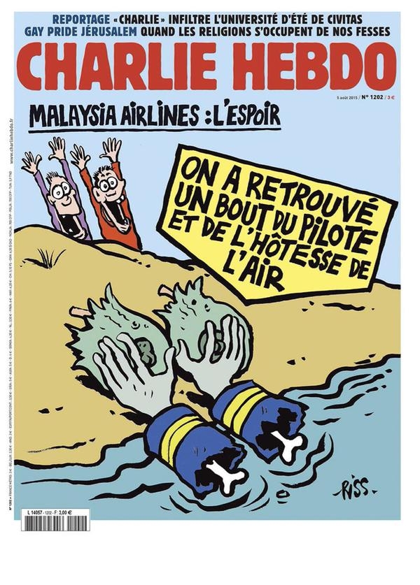 Cititorii considera de prost gust cea mai recenta coperta (foto) a saptamanalului francez, care ironizeaza descoperirea, pe insula Reunion, a unor fragmente din aeronava disparuta in luna martie a anului trecut, potrivit Daily Express.
